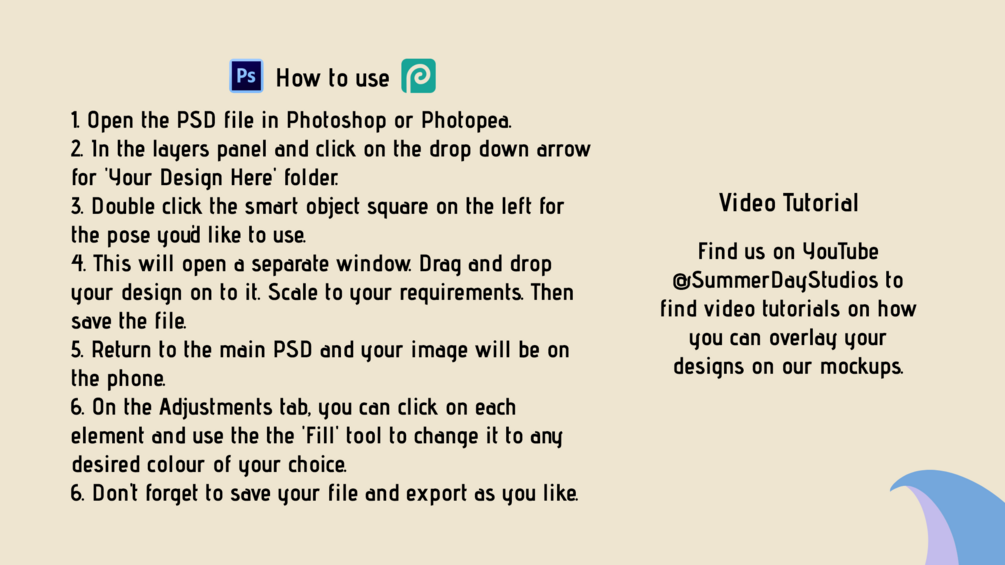 We will provide you with a PDF that summarises what you will recieve on purchase. The pdf will provide you with a link for our Google drive file where you can download your zip file on purchase and then use to showcase your designs using Photoshop or Photopea.